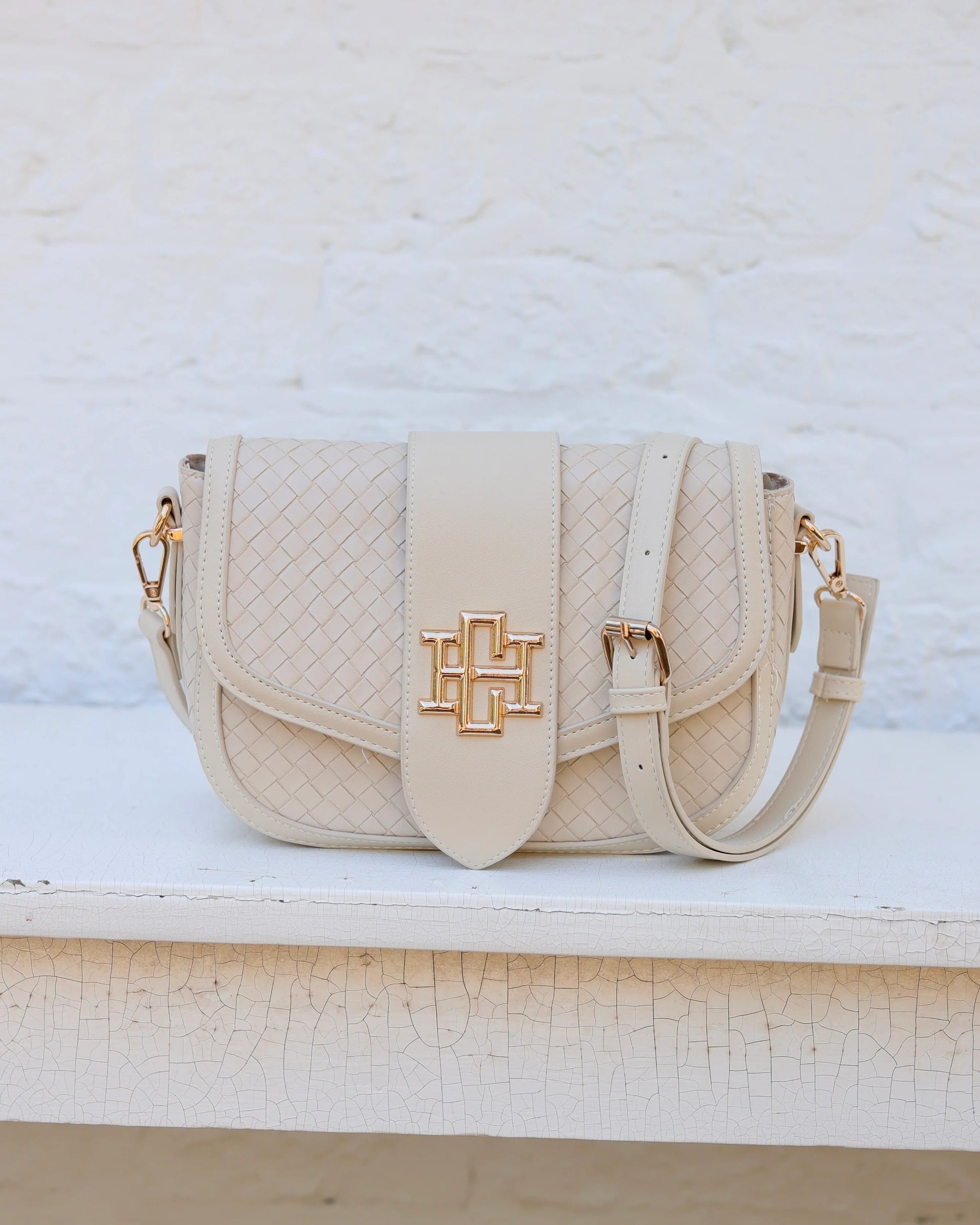 Elevate your style with the Griffin Crossbody Bag in Woven Almond. Crafted from straw material with timeless diamond quilting and black faux lambskin, it showcases the signature shiny gold Caroline Hill logo on a magnetic flap. Inside, stay organized with a zippered pocket and two open compartments, while its structured design keeps the bag looking polished all day. Adjustable Strap for ultimate comfort.